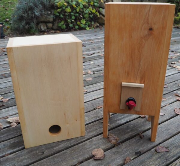Holzbox für Bag in Box mit 5L. Da bis zu 7 Liter im Beutel Platz haben ist die Box entsprechend groß.